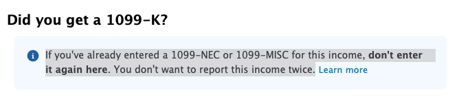 Uber sent me the 1099-NEC and 1099-K. The form shows "If you've already entered a 1099-NEC or 1099-MISC for this income, don't enter it again here. You don't want to report this income twice." So, for doing Uber do I need to enter 1099-K or not?