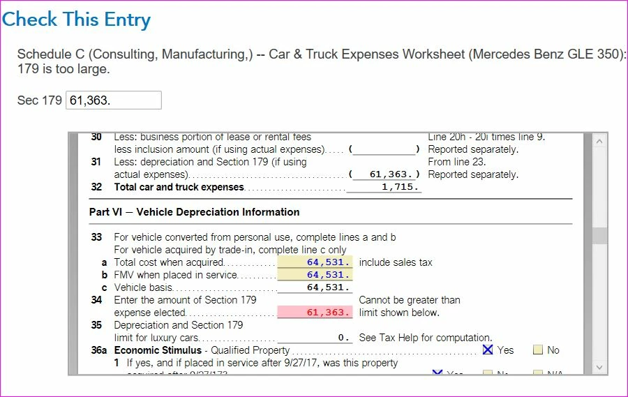 Smart check found one error for Depreciation and Section 179 limit for Luxury Cars. But it showed red in line 34 and said the amount should be less than in line 35.