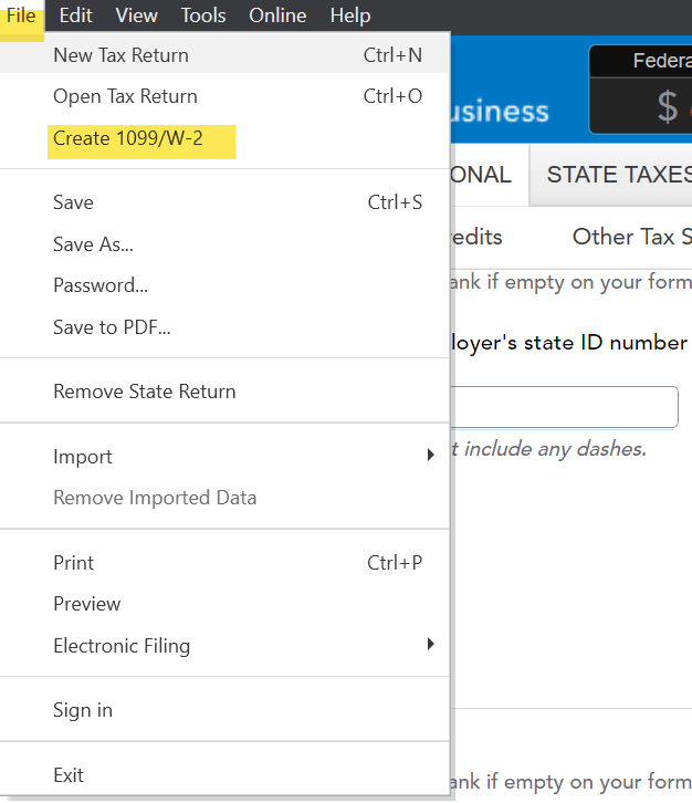 In TurboTax Desktop Home & Business - With your return open, click on File at the top, then choose Create 1099/W-2.