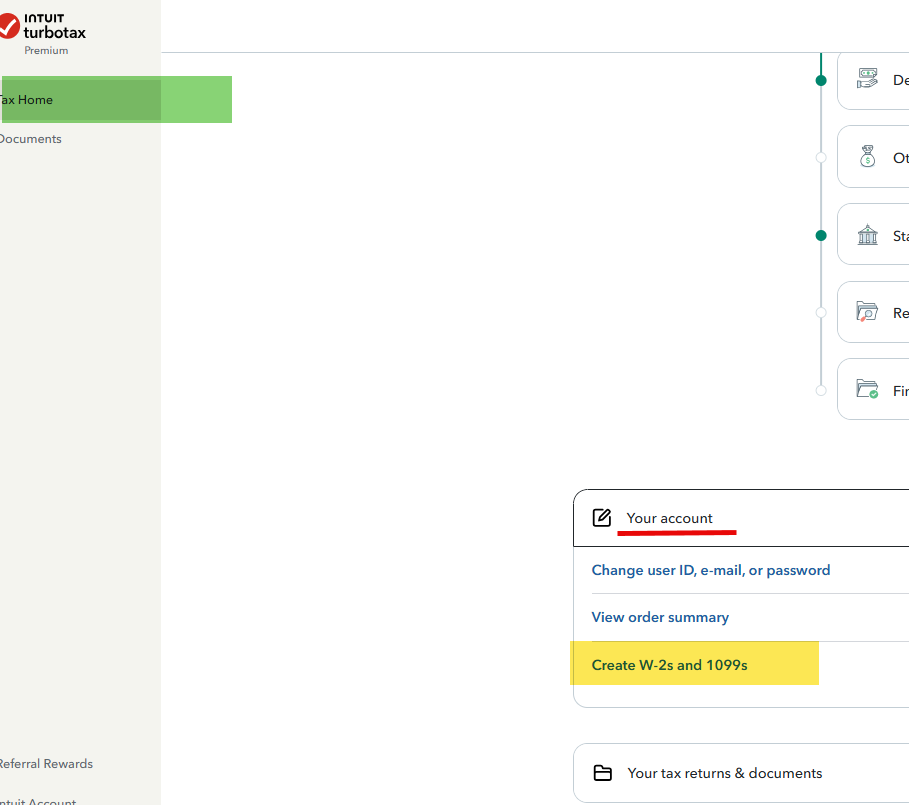 In TurboTax Online Premium - When you sign in, you land on the Tax Home page. Scroll down to Your Account, expand that section, and choose Create W-2s and 1099s.