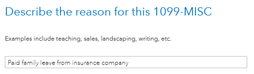 On the Describe the reason for this 1099-MISC screen enter Paid family leave from insurance company