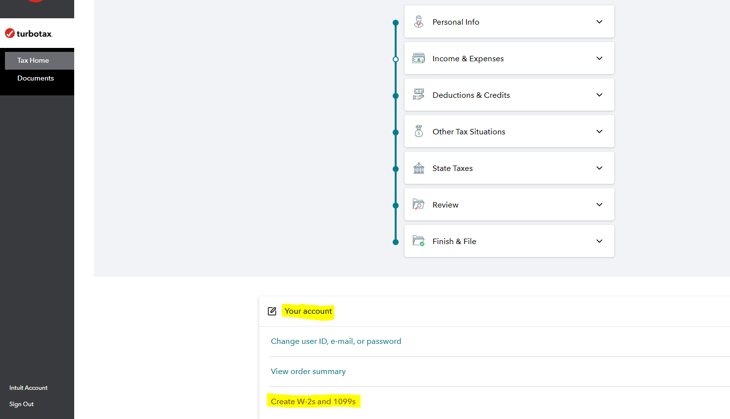 Additionally, please refer to the image below. You can login to your TurboTax Account and press on Tax Home on the left menu. Then scroll down till you see the option " Your Account ". Once you click on it, you should see an option to create 1099s.