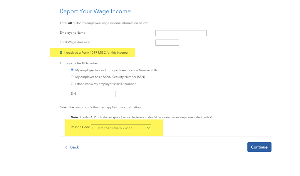 Continue through the interview, at Report Your Wage Income, report the amount from the 1099-MISC, and use the information from W-2 for employer's name and EIN. Check the box "I received a Form 1099-MISC for this income." Select Code H - I received a Form W-2 and a separate Form 1099-MISC