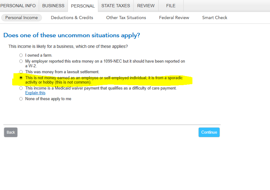 BE SURE TO SELECT "This is not money earned as an employee or self-employed individual ..." on the "Does one of these uncommon situations apply?" screen.