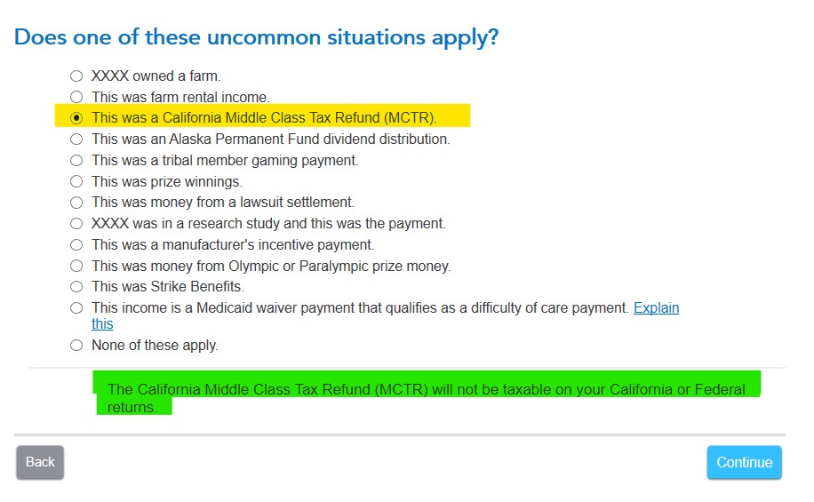 Do I Enter State Stimulus Payments in TurboTax? The 1099-MISC gets entered in the Other Common Income section. Search for 1099-MISC, use the Jump to 1099-MISC link, and enter the information from your form. On the follow-up question, make sure to mark the This was a California Middle-Class Tax Refund (MCTR) box.