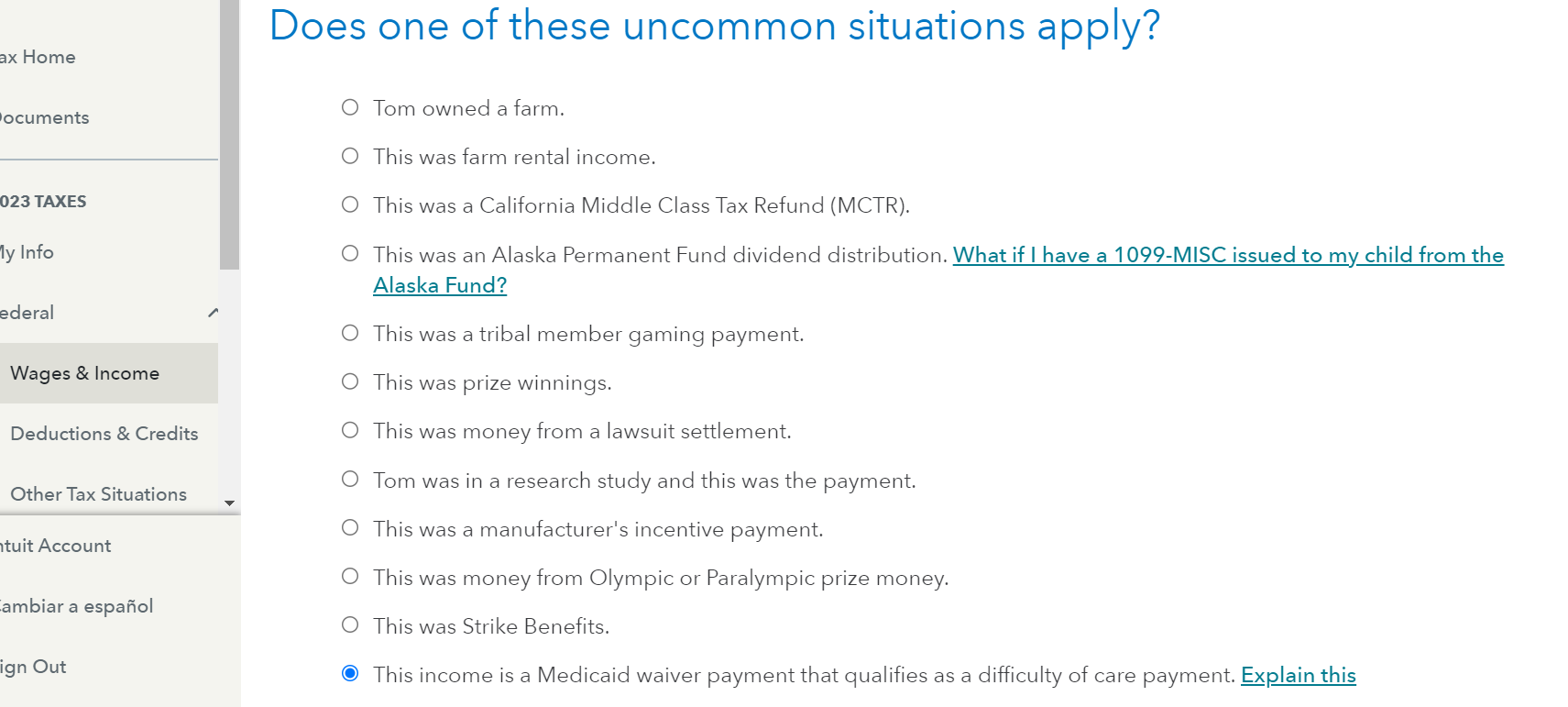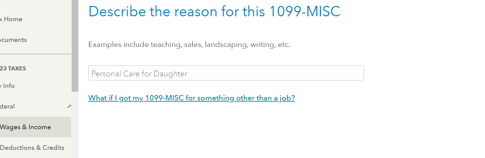 LlknurseForum|Forum|2 years agoFebruary 29, 2024QuestionWe have a 1099-MISC form for a one time $1,000 bonus paid for our work caring for our daughter as PCAs. How do I enter this?Forum|Forum|2 years agoFebruary 29, 20241 reply0 viewsNo text availableTurboTax Deluxe Online