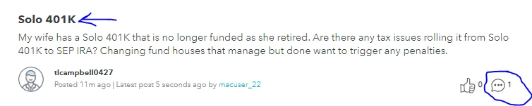 @Detour Not everything is answered yet! All of the questions are coming in right now, and our Experts are answering them as quickly as they can. What @Kslinker said is correct. You can tell if something has a reply when there is a 1 or higher by the speech bubble (see the circled part below - if it shows "0" there is not an answer yet). In order to read the conversation, just click on the title (in this case "Solo 401K"). Hopefully this helps! 🙂