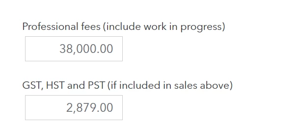 Professional fees should include the total amount you received or will receive in sales, and fees for your fiscal period. This includes money, credits, or the value of goods or services received in a barter transaction (including GST/HST or PST).