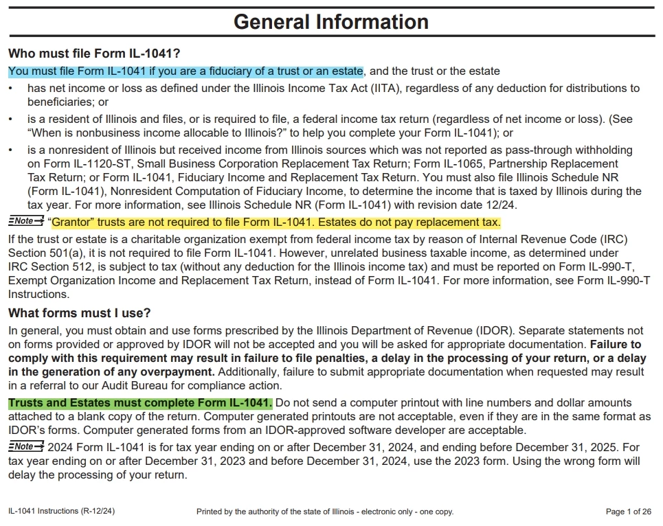 Regarding the respective 1041 state filing, I read through the IL-1041 instructions that I do not need to file this form because it is a "Grantor Trust". Am I reading the yellow highlighted correctly?