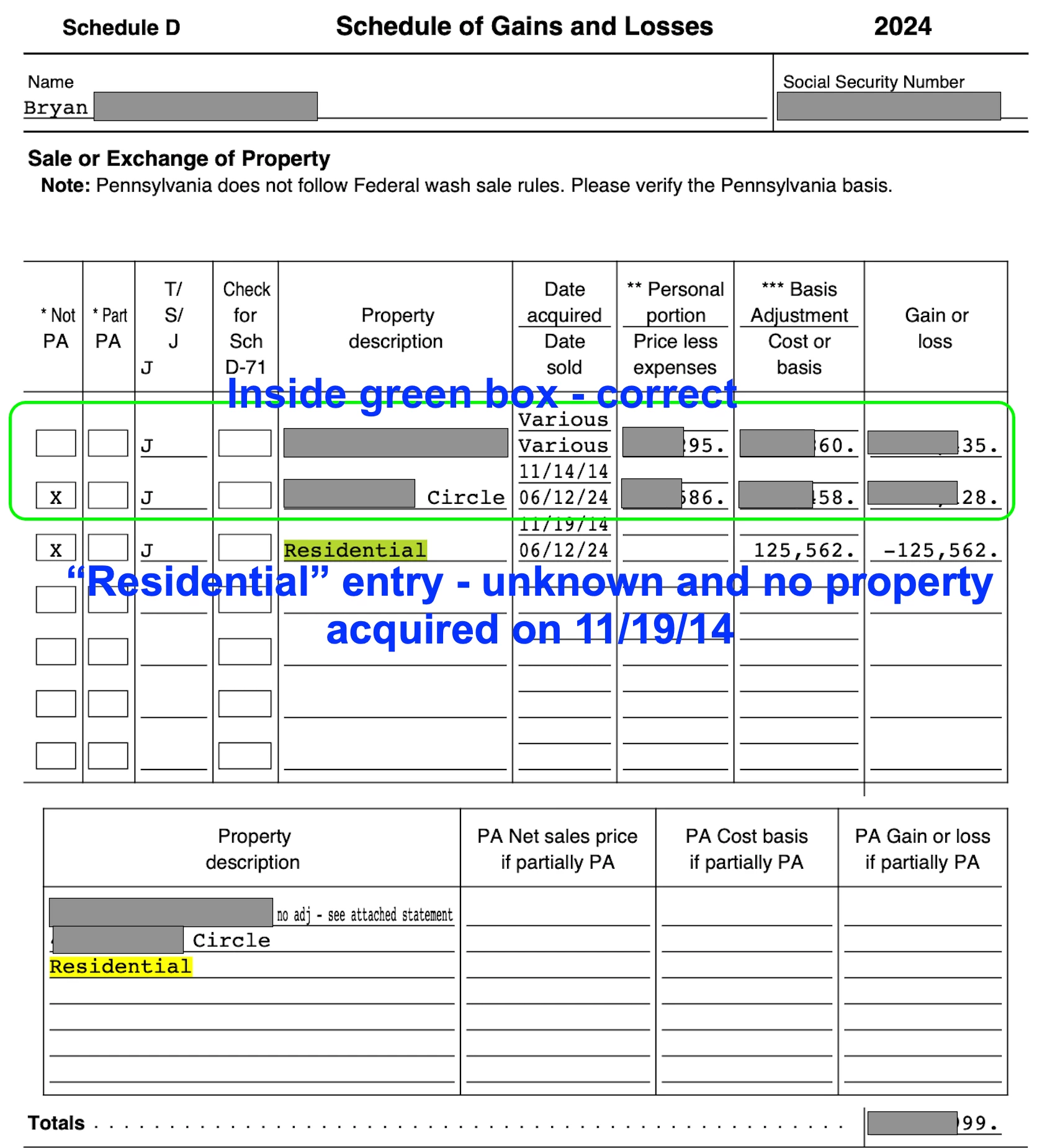 Phantom 'Residential' entry on PA schedule D (schedule of gains/loss) for like kind exchange (1031)