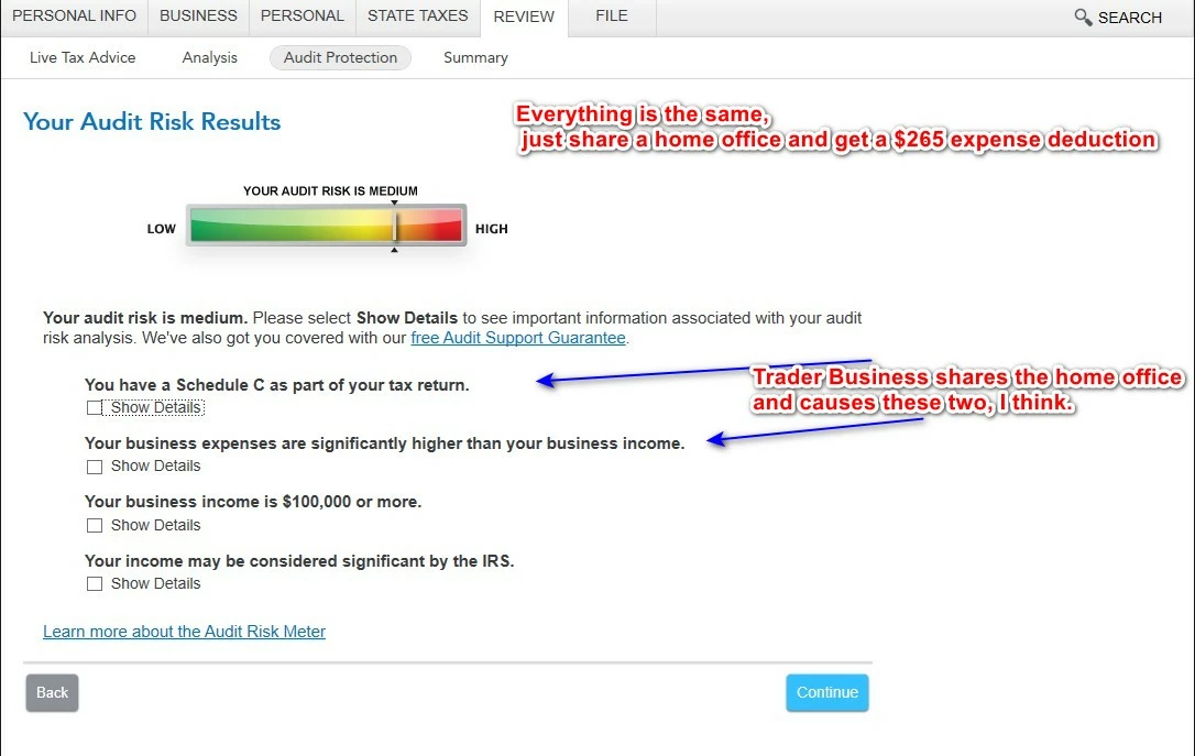 TurboTax confuses me on home office sharing, MTM trader business income, and audit warning